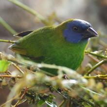 Les mâles ont un visage bleu, vert et noir, tandis que les femelles sont principalement vertes.